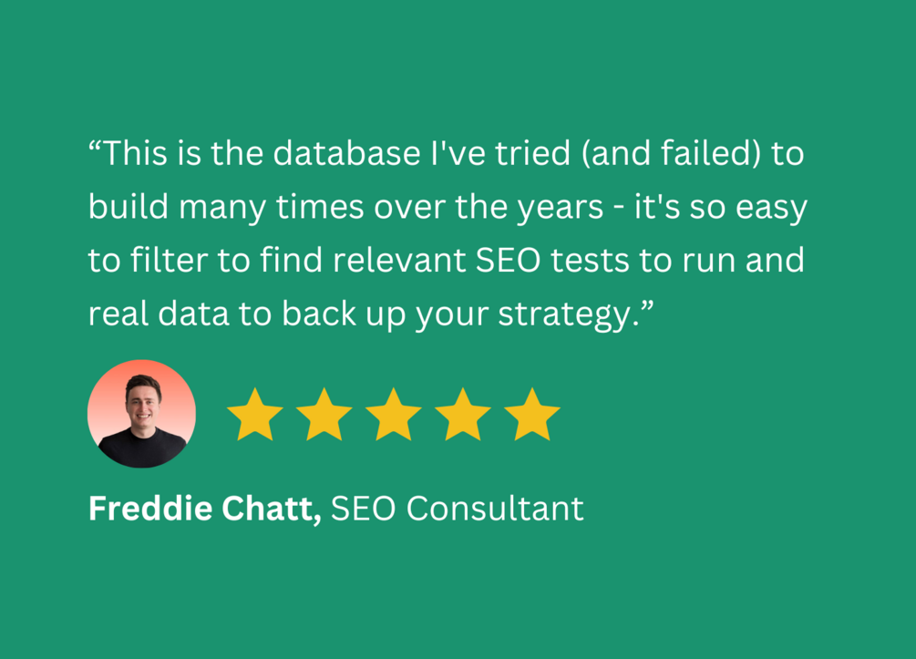 “This is the database I've tried (and failed) to build many times over the years - it's so easy to filter to find relevant SEO tests to run and real data to back up your strategy.” - Freddie Chatt