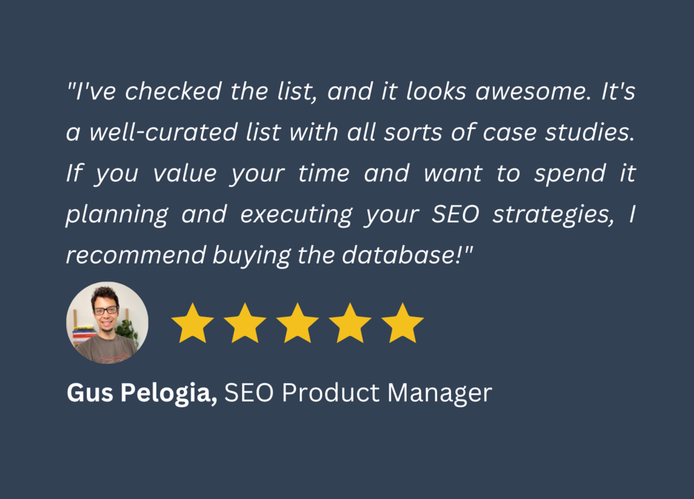 "I've checked the list, and it looks awesome. It's a well-curated list with all sorts of case studies. You can already find them online, but if you value your time and want to spend it planning and executing your SEO strategies, I recommend buying the database!" - Gus Pelogia
