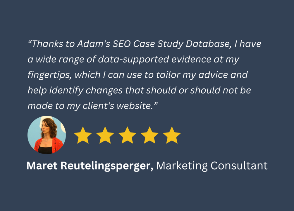 “Thanks to Adam's SEO Case Study Database, I have a wide range of data-supported evidence at my fingertips, which I can use to tailor my advice and help identify changes that should or should not be made to my client's website.” - Maret Reutelingsperger